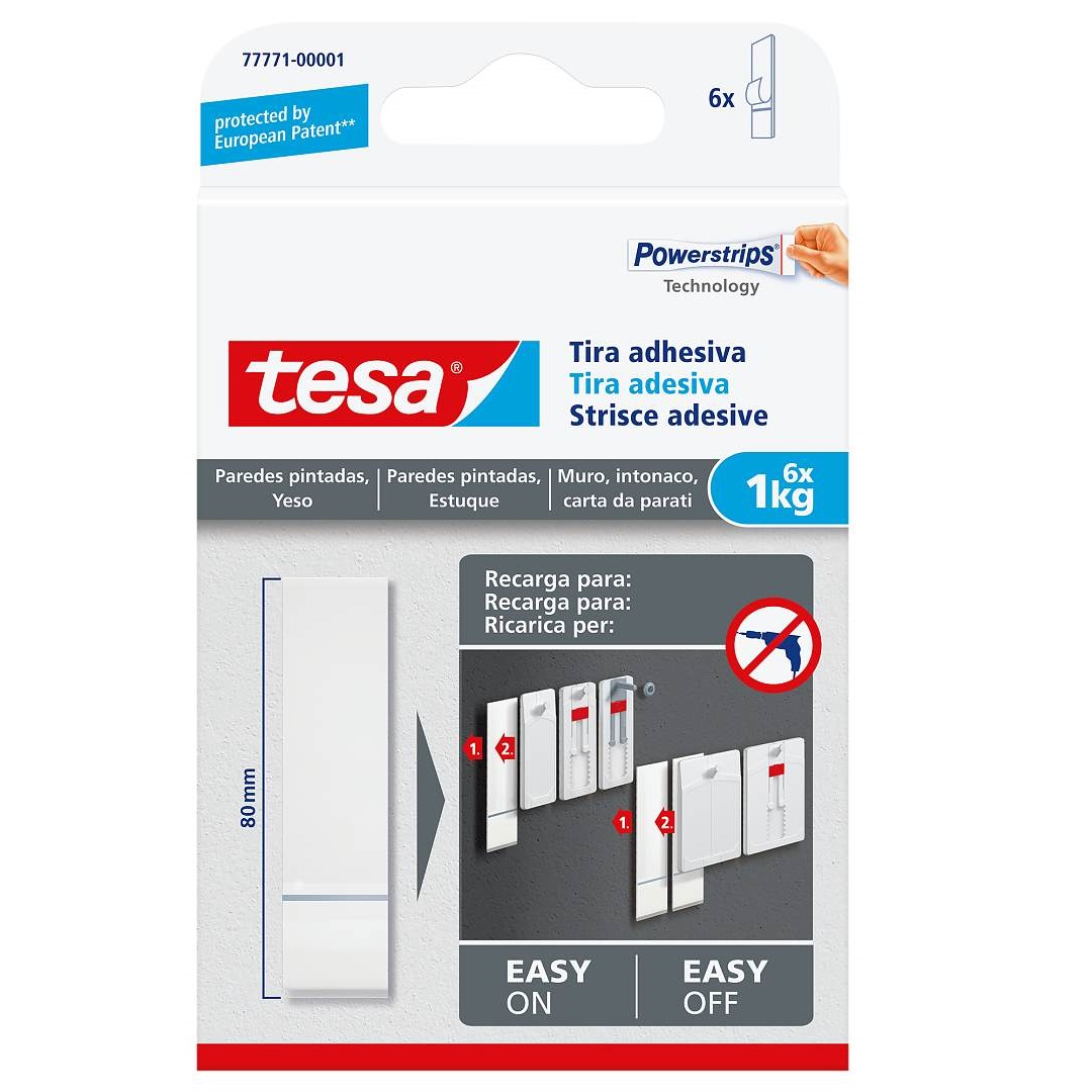 Tiras adesivas para parede pintada e estuque 1kg tesa®. Recarga para reutilização dos Pregos Adesivos para papel de parede e gesso 1kg tesa®. Sistema adesivo especial cujo núcleo de espuma permite que a tira compense de forma otimizada as irregularidades da maioria das superfícies texturadas e sensíveis. Concebidas para papel de parede e gesso, asseguram um suporte fiável e duradouro sem necessitar de recorrer ao martelo ou ao berbequim. A tecnologia Powerstrips® permite pendurar fotografias e outras decorações bem como retirá-las sem danificar a superfície. Para uso com um Prego Adesivo tesa®.