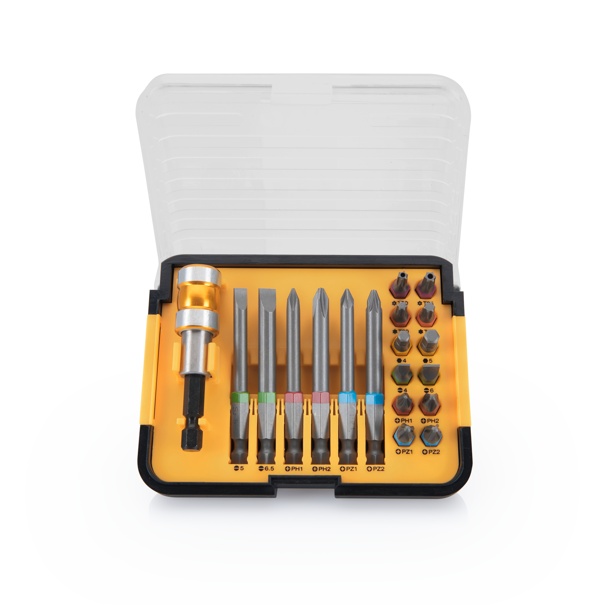 Conjunto 19Bits: BITS 25mm: Phillips: PH1 | PH2 | Pozidriv: PZ1 | PZ2 | Hexagonal: H4 | H5 | Fenda: 4 mm | 6 mm | Torx c/ segredo: T20 | T25 | Torx: T20 | T25 BITS 65mm: Phillips: PH1 | PH2 | Fenda: 5 mm | 6.5 mm | Pozidrive: PZ1 | PZ2